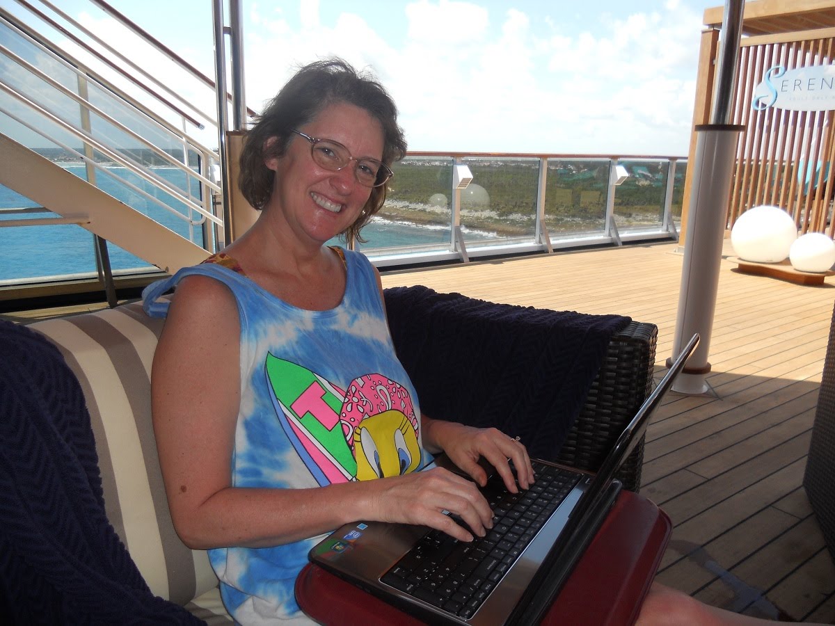Of course, I didn’t spend the entire week vegetating. I did manage to get a tiny bit of work done. Is there a better place to write than on the deck of a cruise ship, sailing over crystal clear waters and having your hair blown with a warm Caribbean breeze? (No cracks about my hair, either. I challenge you to look good after a day in the sun and wind!)