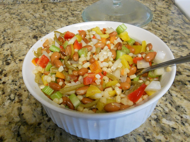 Last week my church had a picnic, and someone brought a delicious chilled vegetable salad. I never found out who brought it so I couldn’t get the recipe. When I got home I did a little surfing on the Internet, and though I didn’t find exactly the same thing, I got some ideas. So I mixed up my own version, and yum! It hit the spot. If you’re looking for a summer salad that’s different from the usual fare, give this one a try. If you don’t have all these ingredients, experiment!